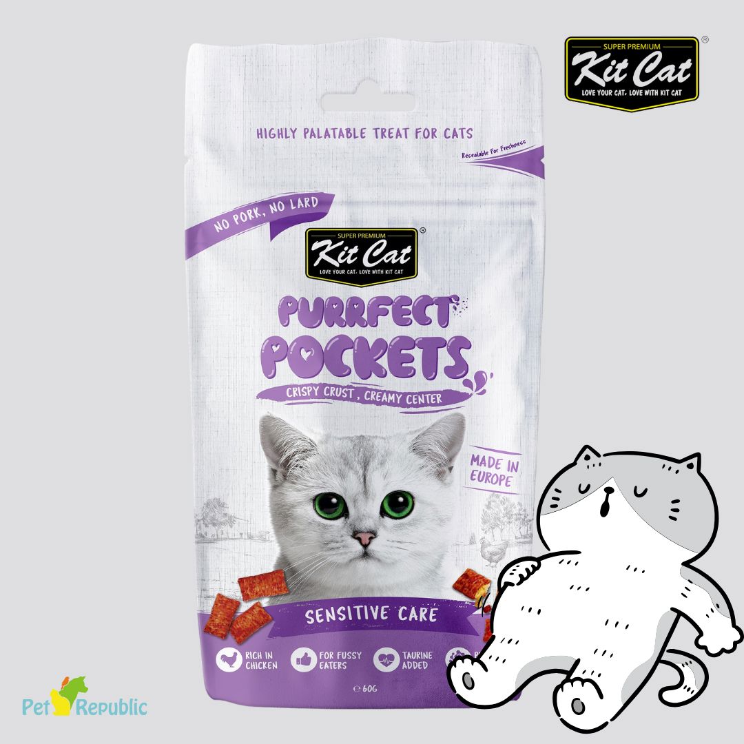 KITCAT Snack Kucing Purrfect Pockets Sensitive Care 60gr merupakan camilan kucing berbentuk crunchy di luar dengan isian lembut di dalam yang diformulasikan khusus untuk membantu menjaga kesehatan pencernaan kucing yang sensitif. Snack ini cocok diberikan sebagai hadiah, selingan makanan, atau untuk membantu meningkatkan nafsu makan.