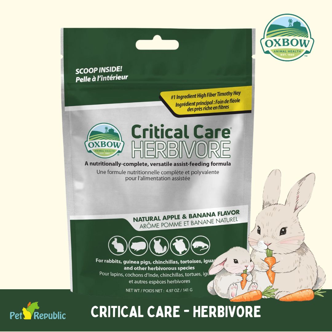 OXBOW Critical Care Apple Banana adalah pakan pendamping khusus untuk kelinci dan hewan herbivora kecil yang sedang dalam masa pemulihan, sakit, stres, atau kehilangan nafsu makan. Diperkaya dengan nutrisi lengkap berbasis timothy hay berkualitas tinggi, membantu mendukung fungsi pencernaan dan mempercepat proses pemulihan.